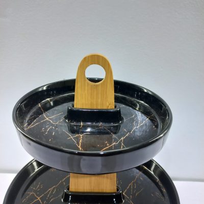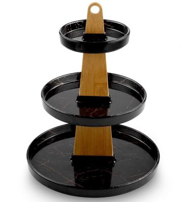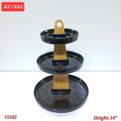 Dimensions: overall height -35cm, diameter: bottom: 27cm, intermediate layer: 20cm, top level: 15cm.Materials: Porcelain, Wood