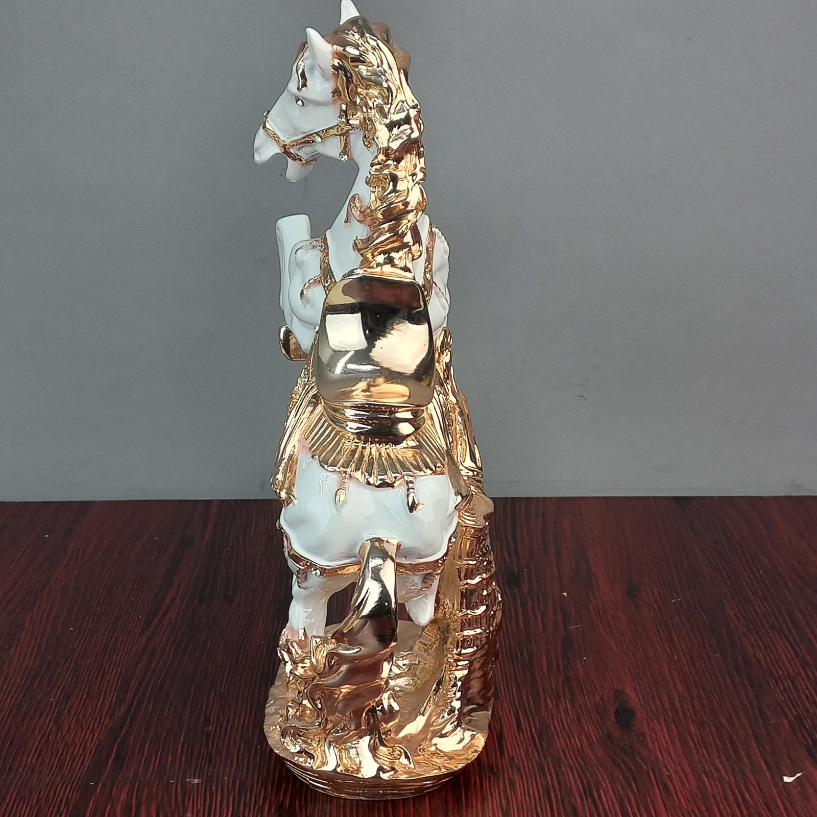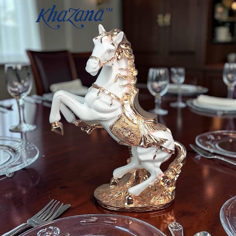 Add a touch of elegance and regality to your living room or office decor with this stunning White & Golden Horse showpiece. Featuring premium craftsmanship and an exquisite aesthetic design, this piece measures 12.5 inches in height and 13.5 inches in length perfect for elevating the look of your display shelf or desk.