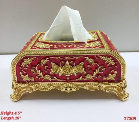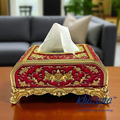 Make a bold statement with this magnificent tissue box holder. The opulent design features a deep red base with a rich, glossy finish, complemented by intricate gold floral and scrollwork carvings. The detailed, ornate patterns on all sides and the decorative legs give it a luxurious, regal feel, reminiscent of classic European decor. This piece is ideal for adding a touch of grandeur and sophistication to any room.