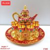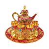 The set includes six matching cups, each featuring a golden interior and a captivating red exterior embellished with golden details and a prominent blue-green stone on a pedestal base, adding to their unique charm. All pieces are elegantly arranged on a coordinating round serving tray, also in a rich red with golden embossed patterns, making it a truly luxurious ensemble.