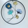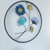 This is a circular piece of metal wall decor featuring a mix of floral and ginkgo-inspired leaf shapes within a black frame.