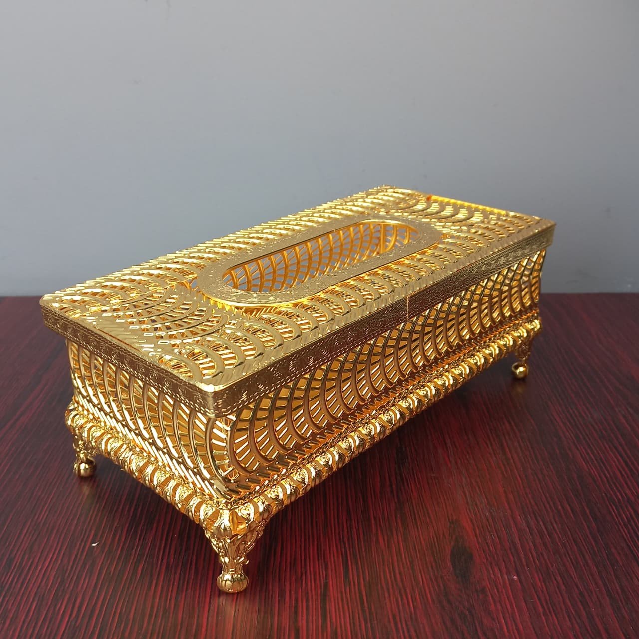 Enhance your interior aesthetics with this exquisite Royal Victorian-style tissue box. Crafted with intricate metalwork and finished in a brilliant gold polish, this piece serves as both a functional utility and a sophisticated decorative accent for any luxury setting.