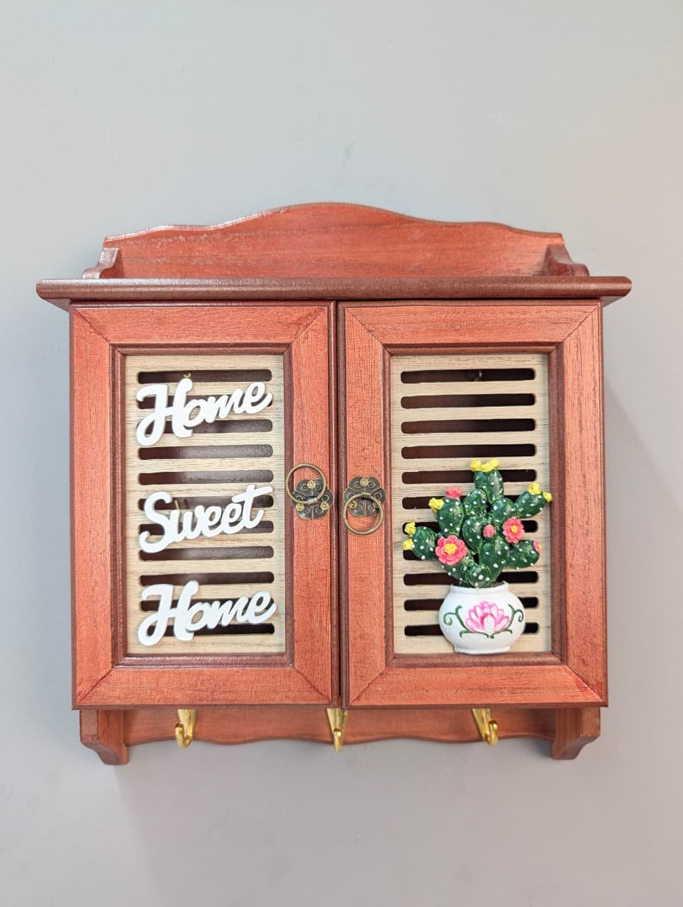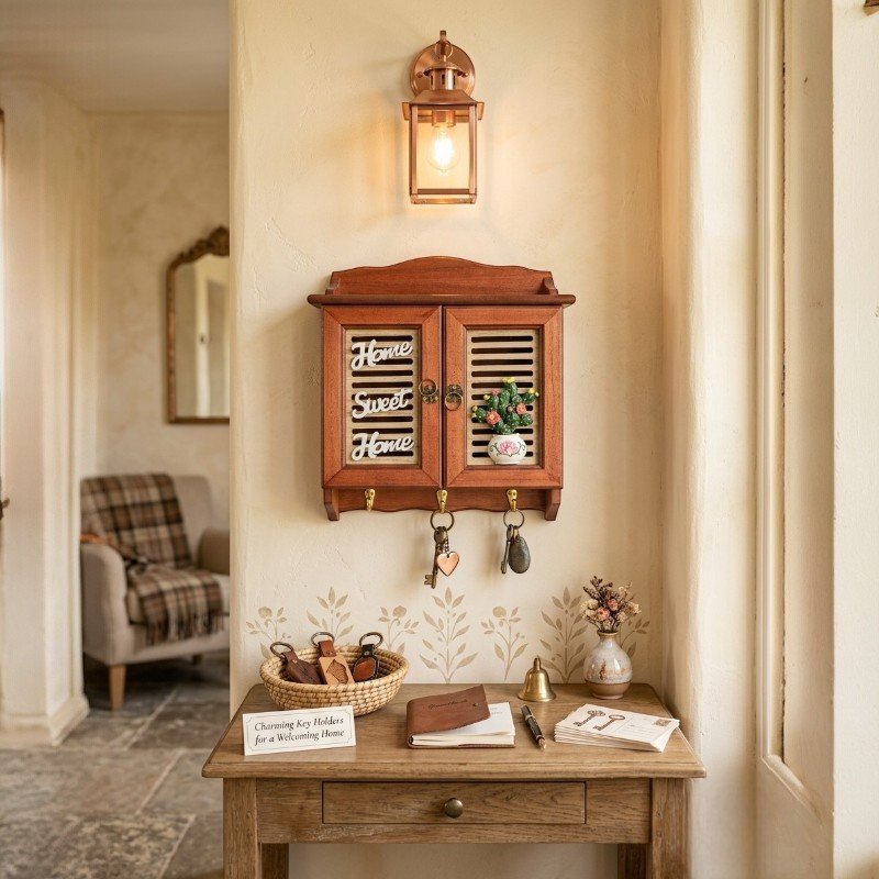 This elegant wall-mounted key holder blends timeless craftsmanship with practical organization. Designed to bring a warm, inviting feel to your entryway, it features a classic wooden finish and intricate detailing that complements a variety of interior styles, from farmhouse to traditional.