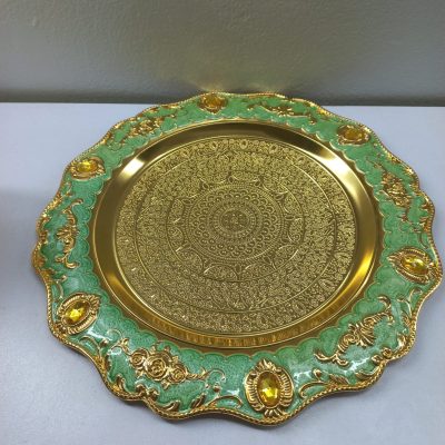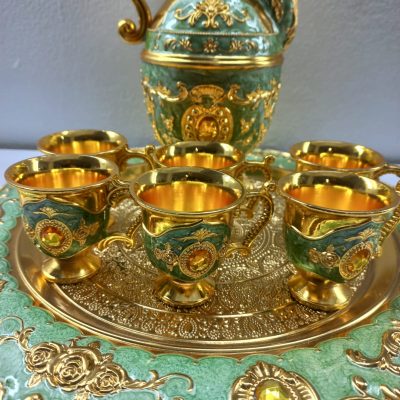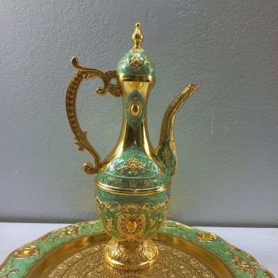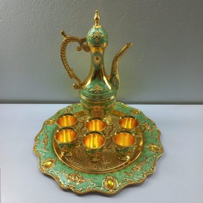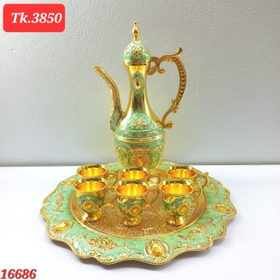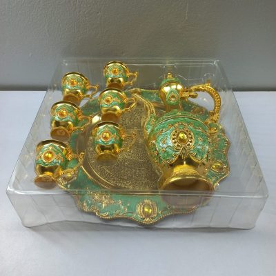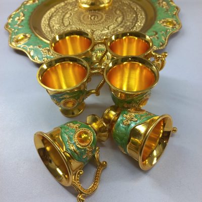 Shinny golden metal surai set round tray jug with siz pcs cup tea set