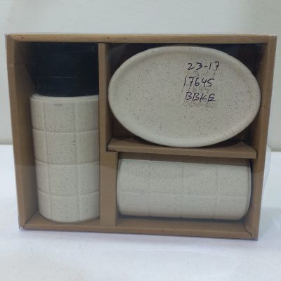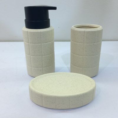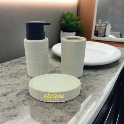 This is a three-piece bathroom set with a speckled, light-colored finish and a raised grid pattern. The set includes a tall, cylindrical soap dispenser with a black pump, a tumbler cup, and a round soap dish. The items are made of a material that has a textured, slightly uneven surface, giving them a rustic yet modern feel. A “Khazana” logo is visible on the soap dish. The set is displayed on a grey granite-like countertop with a white sink basin in the background.