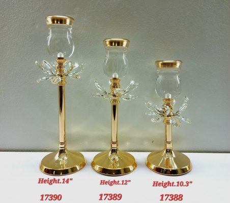 A set of three modern candle holders, varying in height. Each piece has a polished golden finish, featuring a round base and a slender stem. A cluster of clear, leaf-shaped crystals surrounds the stem, just below the clear glass tulip-shaped top.
