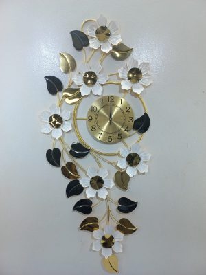 Adorn your wall with this exquisite metallic wall clock, designed with a graceful vertical flow of intricate floral elements. This stunning timepiece features a captivating arrangement of white and dark accented flowers with reflective centers, elegantly framing a classic gold-toned clock face. The golden branches and dark leaves add a sophisticated contrast and artistic flair. Ideal as a captivating focal point in narrower wall spaces, hallways, or alongside other decor.