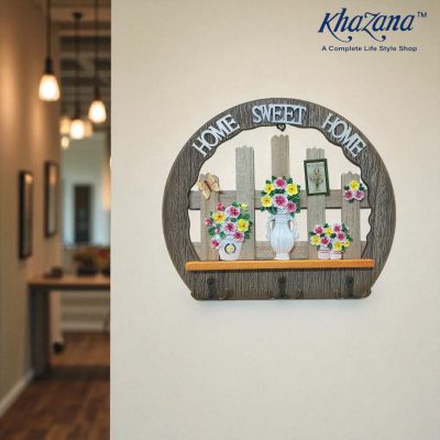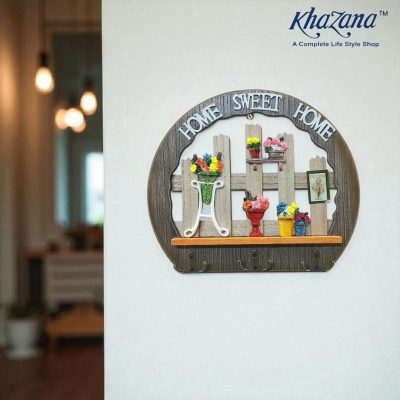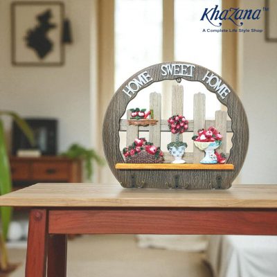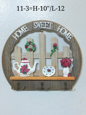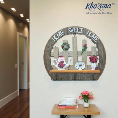 Below the decorative scene is a useful shelf or ledge and a row of five metal hooks perfect for hanging keys, leashes, small jackets, or other lightweight items.