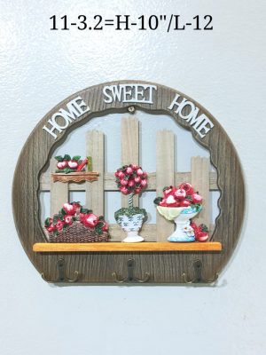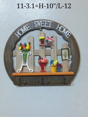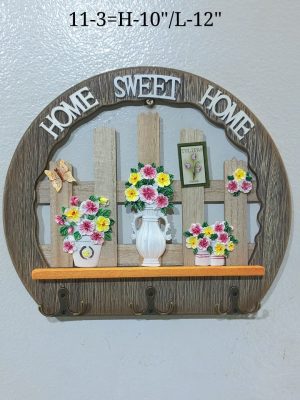The piece features a curved, faux-wood frame with the words “HOME SWEET HOME” arched across the top. The central design depicts a charming garden scene with a wooden fence background, complete with vibrant, colorful 3D floral arrangements in vases and pots, a butterfly, and a small “Tulips” sign.