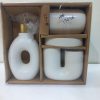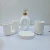 A four-piece white ceramic bathroom accessory set with a minimalist, modern design. The set includes a soap dispenser with a gold-toned pump, a soap dish, and two tumbler-style holders. The soap dispenser and the soap dish have a rounded, organic shape, while one of the tumblers features a unique, curved “U” shape and the other is a simple, rounded cylinder. The entire set is a clean white color with a matte finish, suitable for a contemporary bathroom decor.